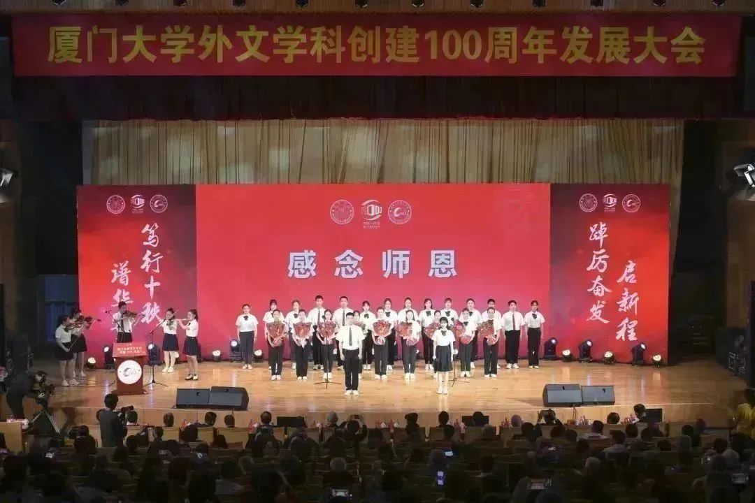 一脉师德,润泽桃李,感念师恩,薪火赓续。一百年来,一代又一代的外文教师不忘从教初心,牢记育人使命,在教学与科研战线上辛勤耕耘,竭诚付出,为厦大外文的发展做出了巨大的贡献。大会特别举行了感念师恩环节,在深情的朗诵和歌声中,学生们搀扶着白发婆娑、耄耋之年的退休教师们走上舞台中央,为他们送上感恩的鲜花和诚挚的祝福。