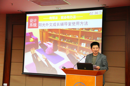 表彰大会于14日上午8时30分准时在克立楼三楼报告厅举行。当天下午,外文学院党委杨云良副书记代表学院,以《房间里的那点事儿》为题做特色工作汇报,从学院心理健康教育特色基地的成立与发展历程铺陈展开,对学院2016年度新设计的特色项目“阳光外文成长辅导室”进行详细介绍,从项目源起、内容、现状和未来展望等四个方面与大家进行经验交流——“如何让特色基地的特色项目更有特色?”杨老师在汇报中强调,希望“阳光外文成长辅导室”能成为关注学生诉求、促进学生发展、服务学生成长的星星之火,为学生点亮理想的灯、照亮前方的路,如同习近平总书记在全国高校思想政治工作会议上提出的要求,在日常工作中真正实现“围绕学生、关照学生、服务学生”。