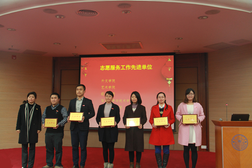 杨盛澜老师(右一)代表学院领取“志愿服务工作先进单位”奖牌