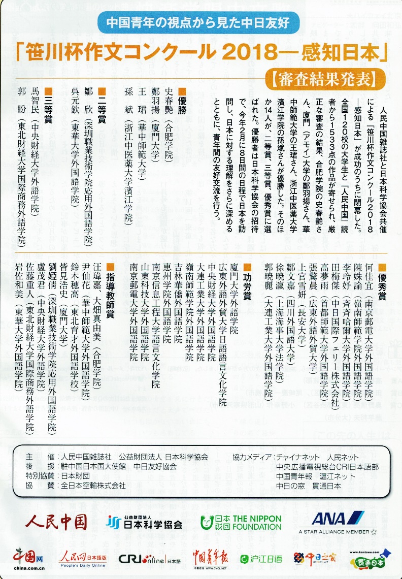 “笹川杯”作文比赛主办方之一的人民中国杂志社刊物《人民中国》是由文化部外文出版发行事业局承办,创刊于1953年,已有65年的办刊历史。是目前中国唯一一本在中日两国公开发行的国家级日文综合月刊杂志,以促进中日友好、增进日本人民对中国的了解”为办刊宗旨,内容着重反映中国人民在政治、经济、文化等各个领域的成就和精神面貌,介绍中国的历史、地理、风土人情和人民生活的现状。日本科学协会则是成立90余年,以促进科学家的合作和科学知识的普及为主要活动内容的公益组织。该比赛每年的优胜奖获得者将受日本科学协会的邀请,前往日本与日本青年进行为期8天的交流,获奖作品也将在《人民中国》杂志上刊载。