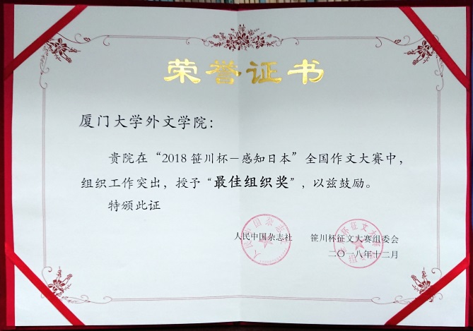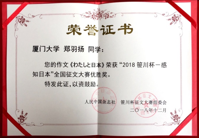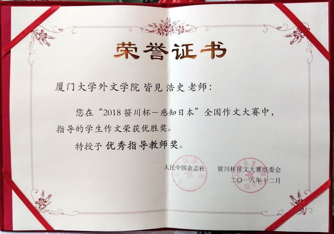 由人民中国杂志社和日本科学协会共同举办的“2018笹川杯——感知日本全国征文大赛”顺利闭幕,并于12月10日发表评审结果,我院师生荣获该赛事三项大奖。日语系2015级本科生郑羽扬同学荣获冠军(优胜奖)、皆见浩史老师荣获“优秀指导教师奖”、厦门大学外文学院荣获“最佳组织奖”。这也是日语学子在11月份荣获“第13届广岛大学日语作文演讲比赛”团体金奖、个人特等奖和三等奖之后的又一座大满贯。再一次彰显了我院学子的良好风貌和扎实的日语语言功底,为我院增光添彩。